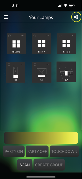 - Select individual lamps by clicking on the circle in the upper left corner of its icon. You may select multiple lamps this way, or select “All Lamps” to control all connected lamps simultaneously.